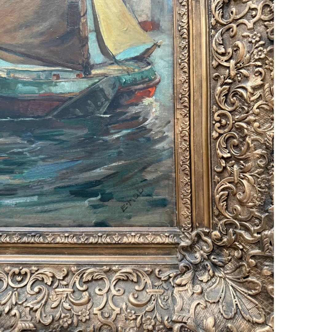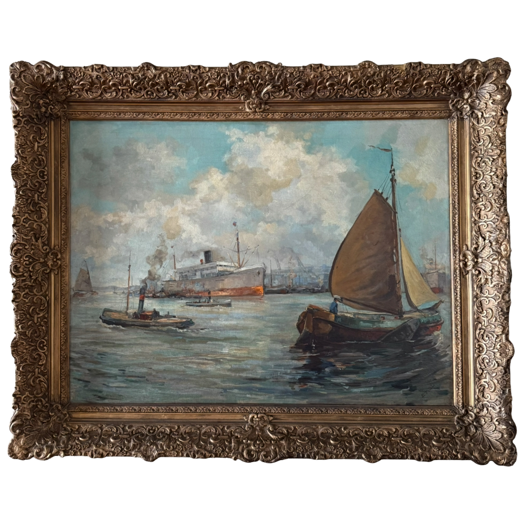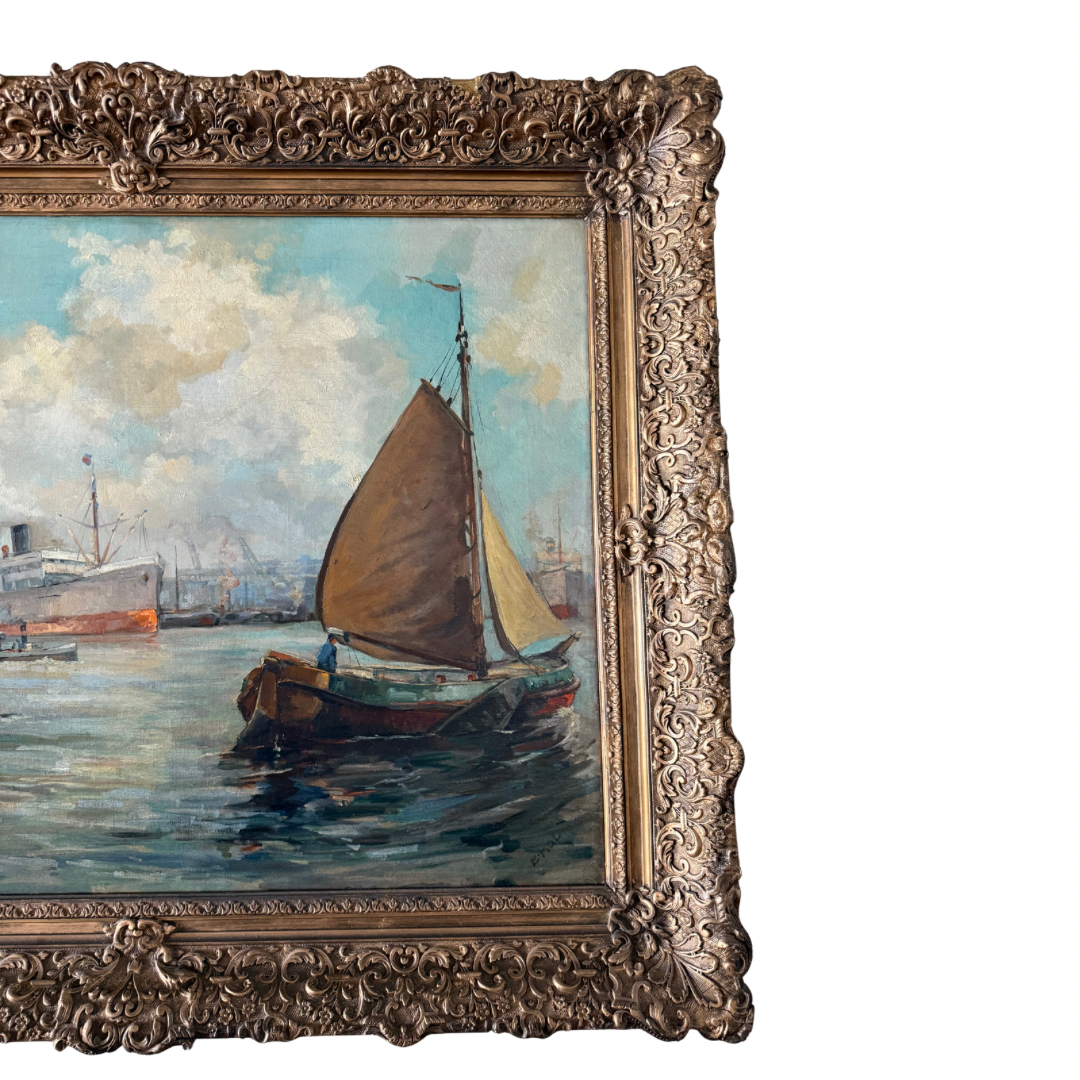 Antique Harbor Scene - Oil on Canvas