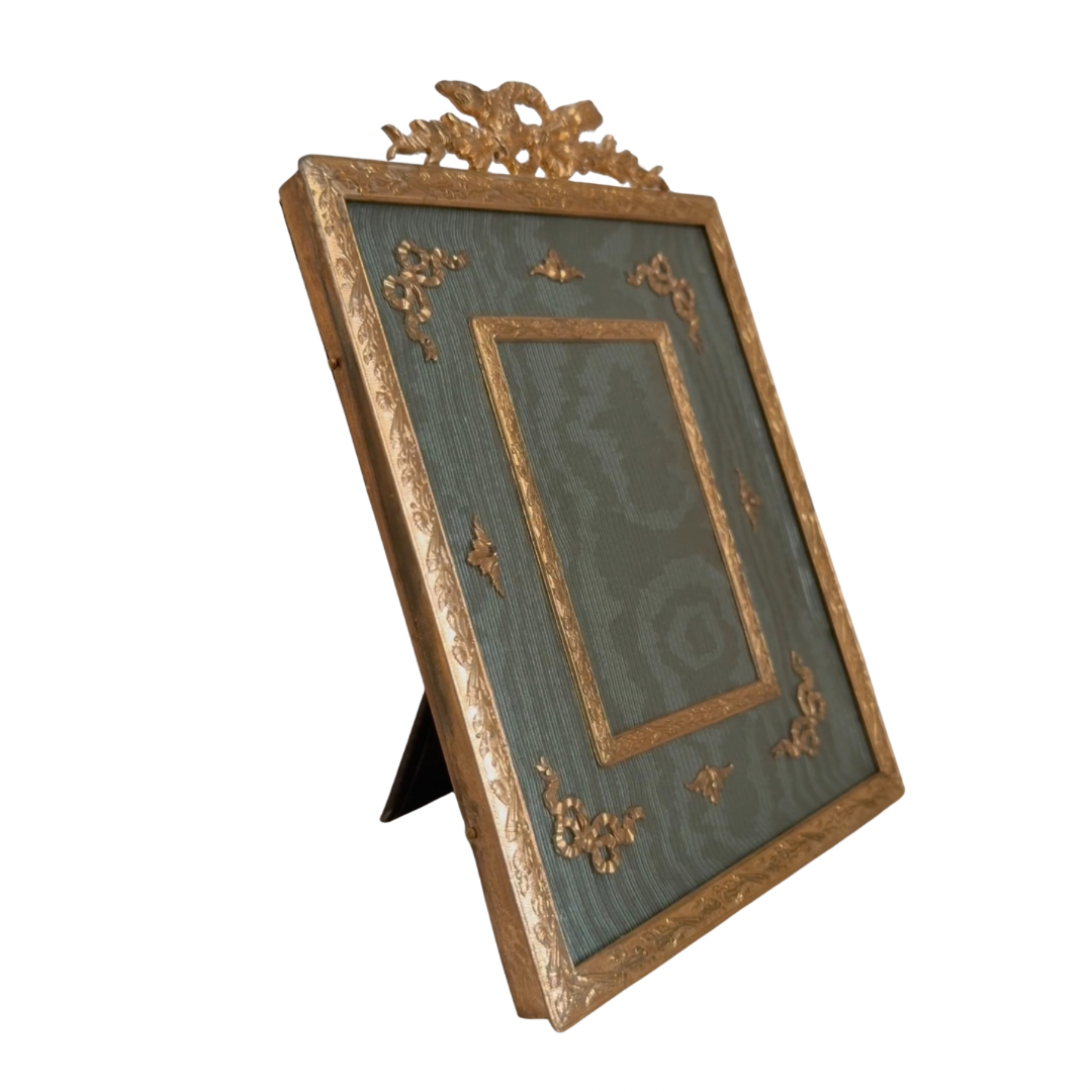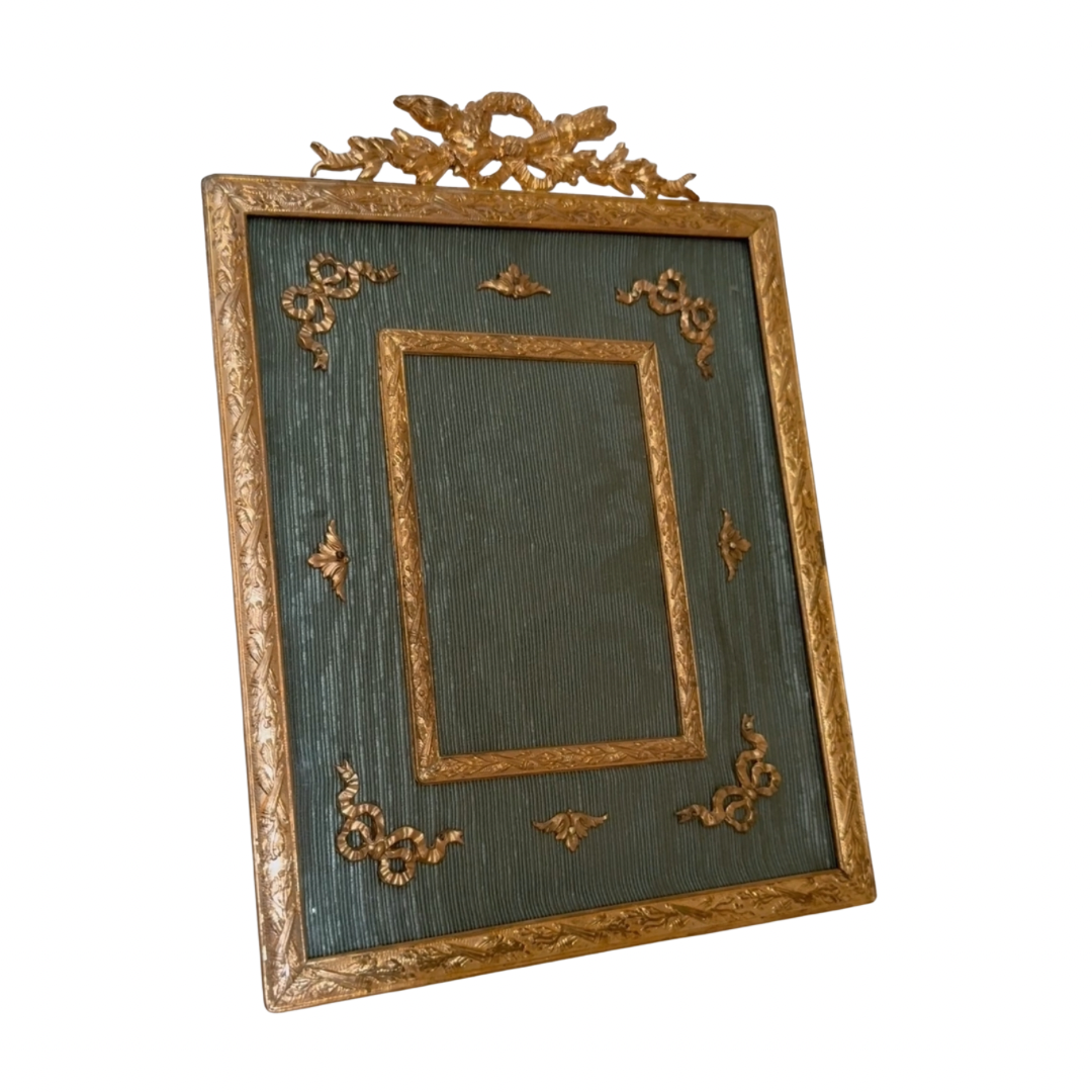 French gilt-bronze photo frame from the late 19th–early 20th century. Rectangular in form, it features a ribbon-tied crest and corner mounts, with a green moiré silk mat.