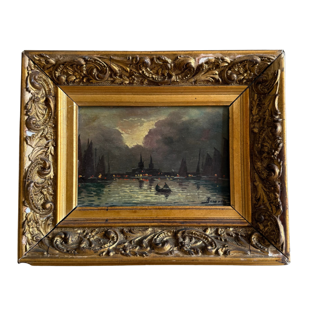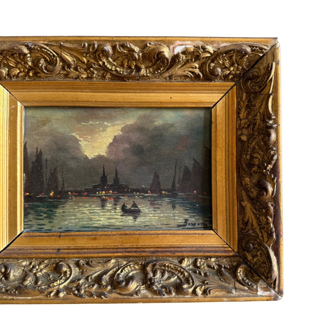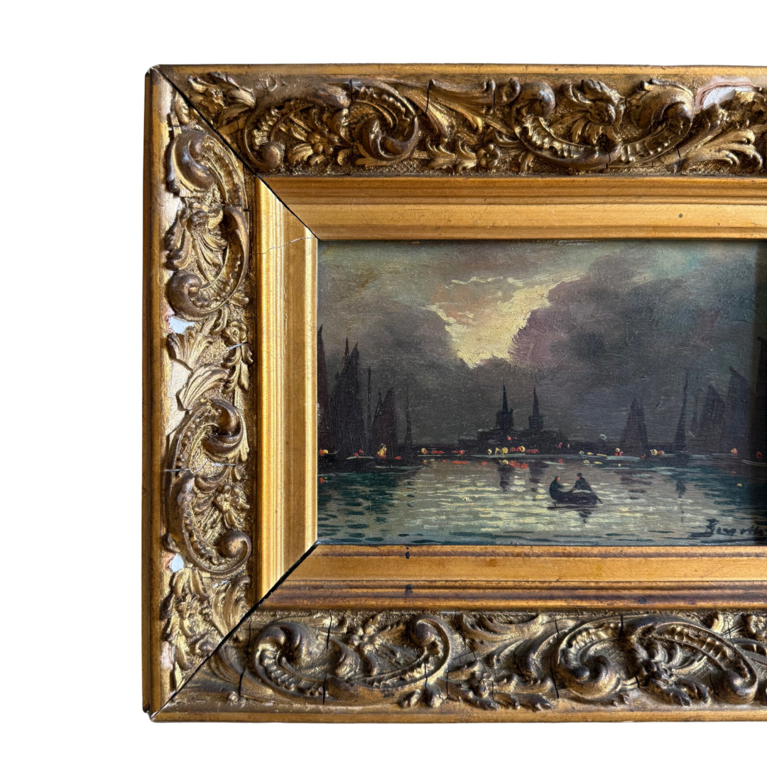 The work is presented in an ornate gilt frame with bold foliate and scrollwork carving, complementing the moody elegance of the scene. Signed indistinctly lower right.