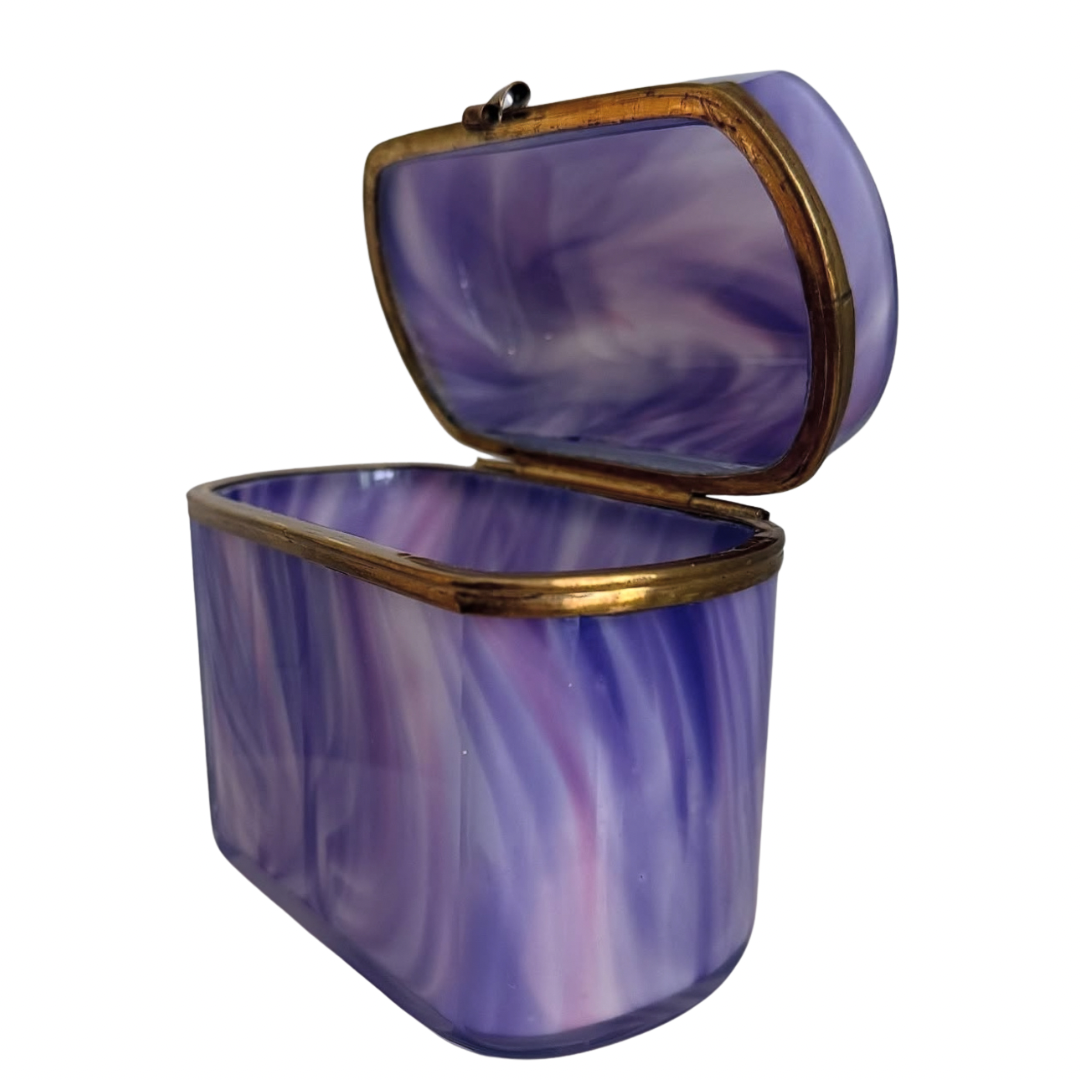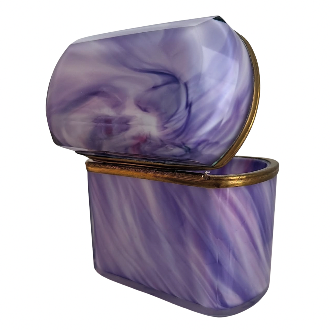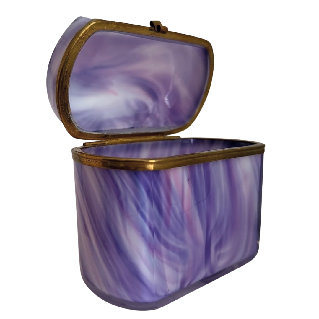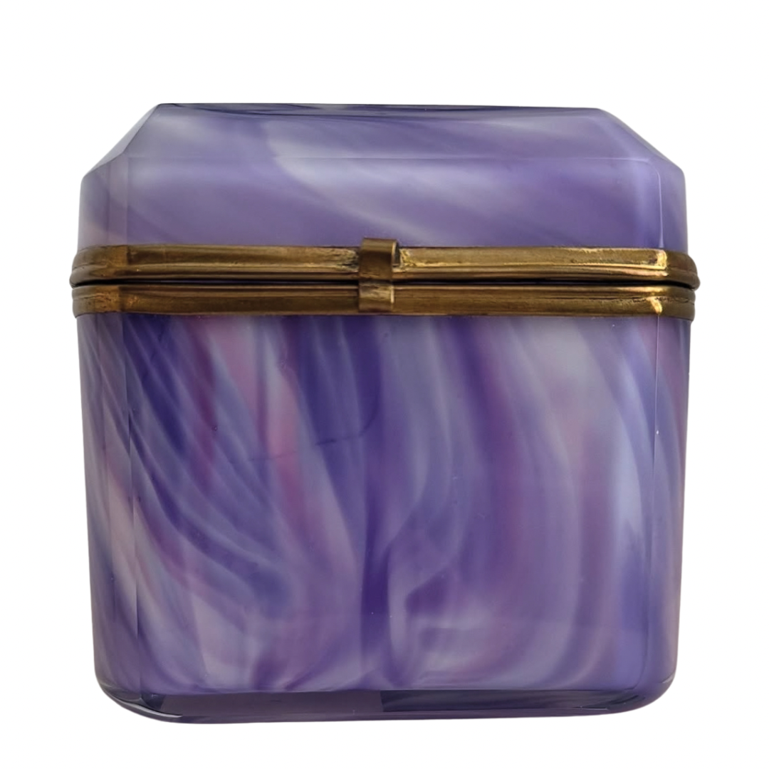 Circa 1880–1910, this casket captures the fascination with “agate glass,” a decorative glass designed to mimic the depth and movement of stone while retaining the luminosity of glass. Its swirling hues of lavender, violet, and soft white imitate the veining of natural agate.