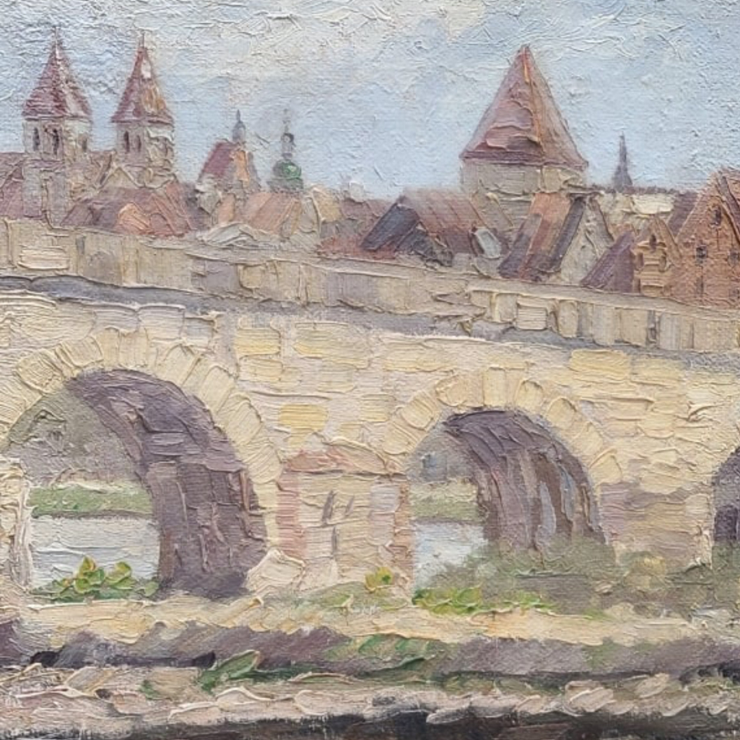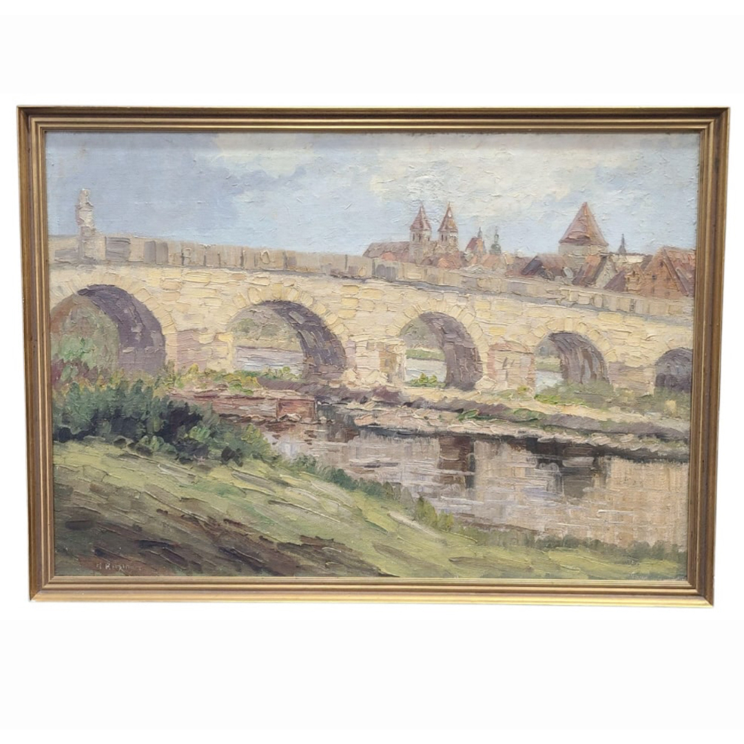 Hedwig Reisinger (German, 1903–1998) original oil on canvas of the Stone Bridge of Regensburg, circa 1930. The work captures the medieval stone bridge with its series of arches stretching across the Danube, framed by the rooftops and towers of the old city in the background. Rendered in a soft yet textured impressionist style.